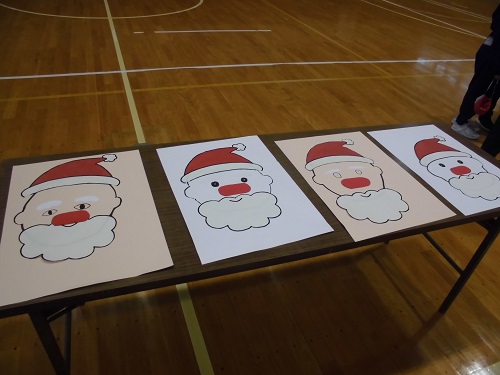 次に、サンタの福笑いをしました。校内に隠されたパーツを縦割り班で探して集めサンタの顔を完成させます。