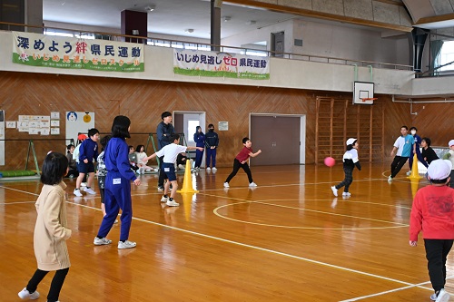 今回はその第2弾で、内容は、縦割り班によるドッジボールでした。子どもたちは、寒さに負けず元気いっぱいドッジボールを楽しんでいました。